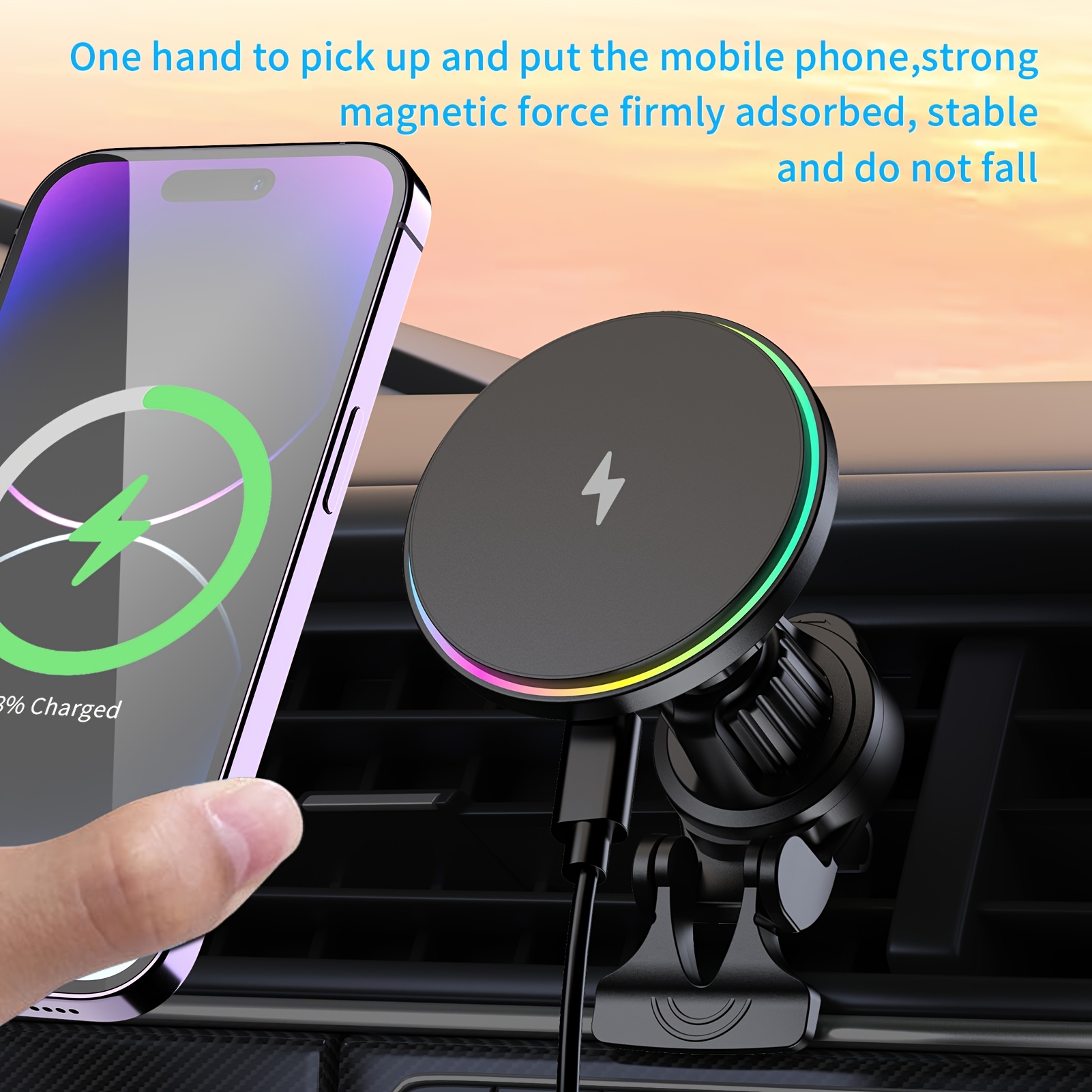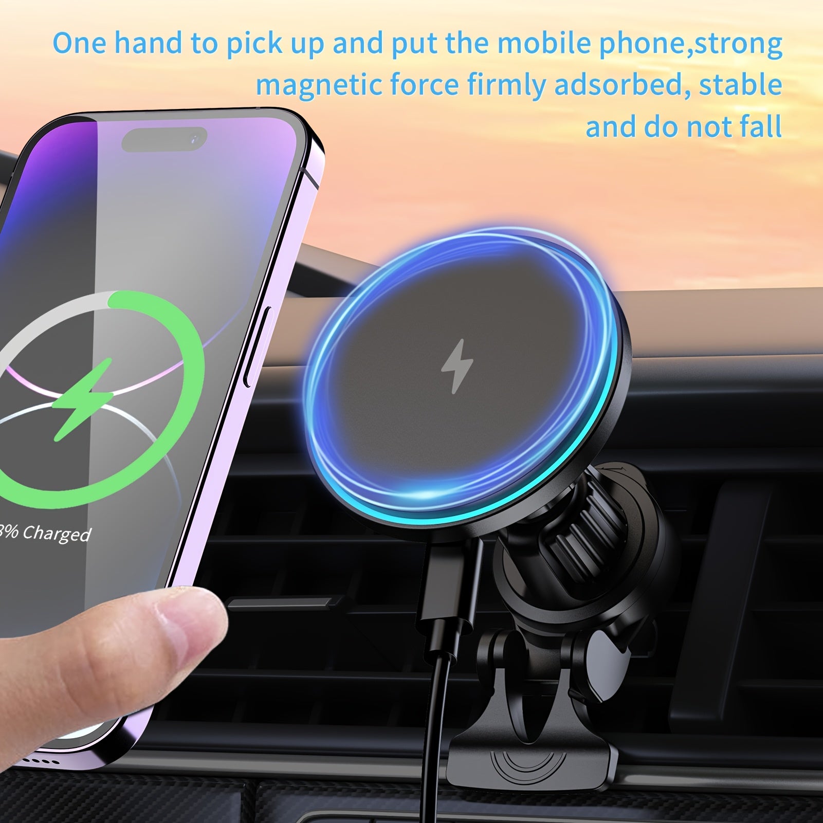 15W Magnetic Car Charger, Featuring a Strong Magnet, This Magnetic Wireless Charging Mount Is Compatible with Iphone 15 Pro Max, 14, 13, 12 Plus. It Is a Qi Car Charger with a Magnetic Design, Allowing for 360° Rotation And