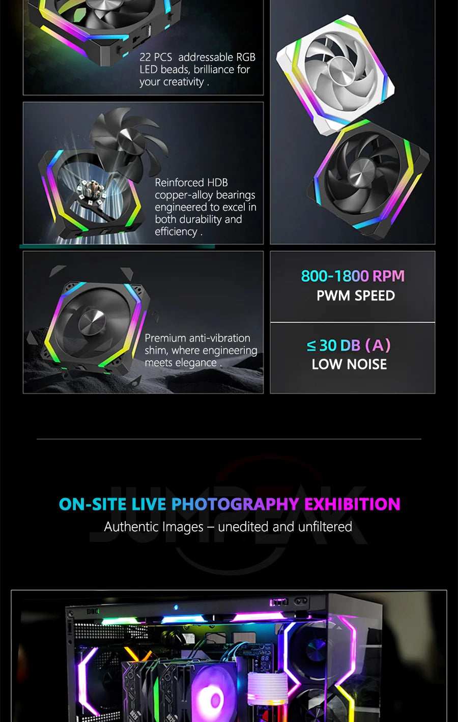 JUMPEAK CS120 ARGB 120mm PWM Cooling Fan, Modular Stackable RGB Case Fan with Fluid Bearing, Silent 800–1800RPM, 5V 3-Pin ARGB Lighting for PC Case and Radiator