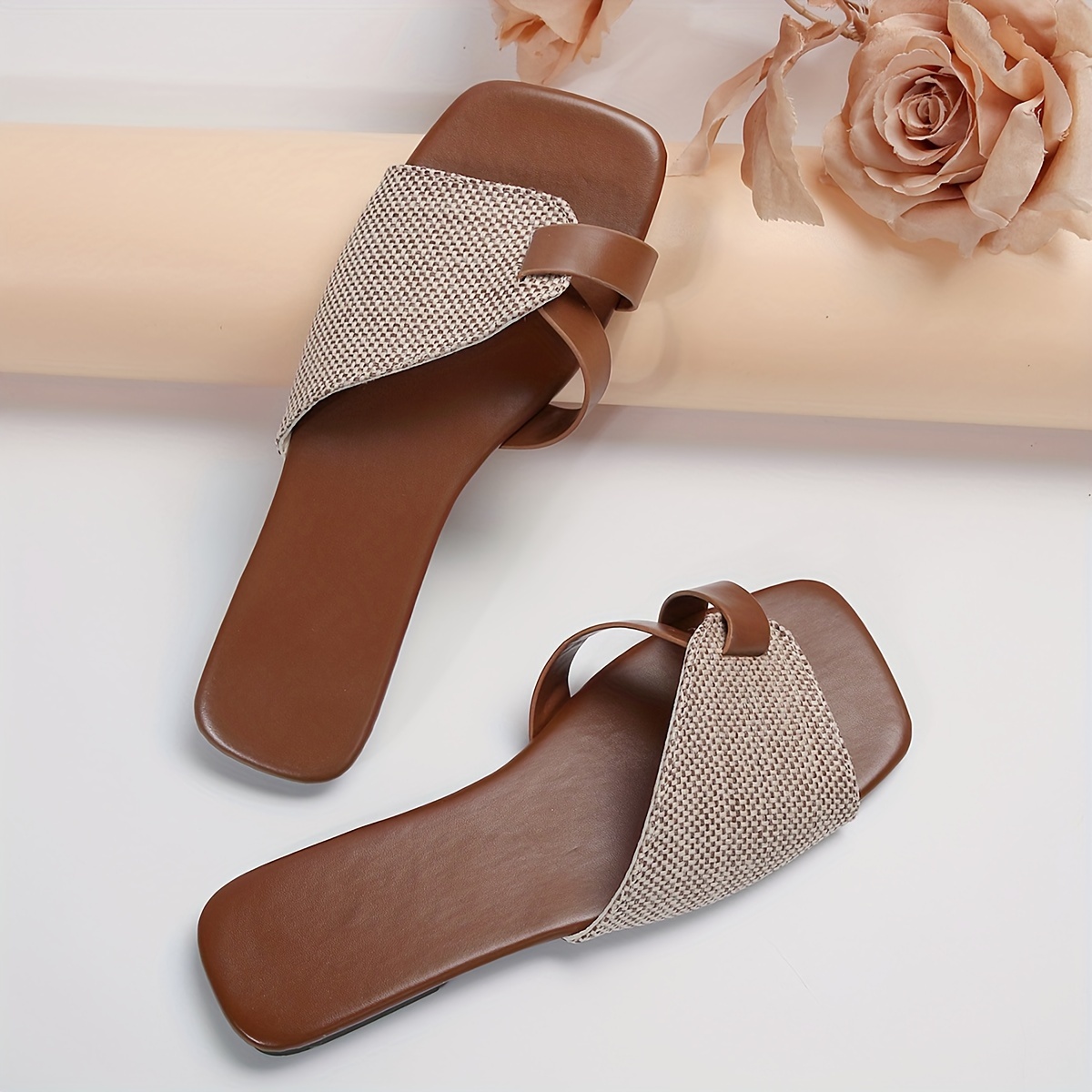 Women's Contrast Color Slide Sandals, Casual Square Toe Flat Summer Shoes, Lightweight Slide Sandals